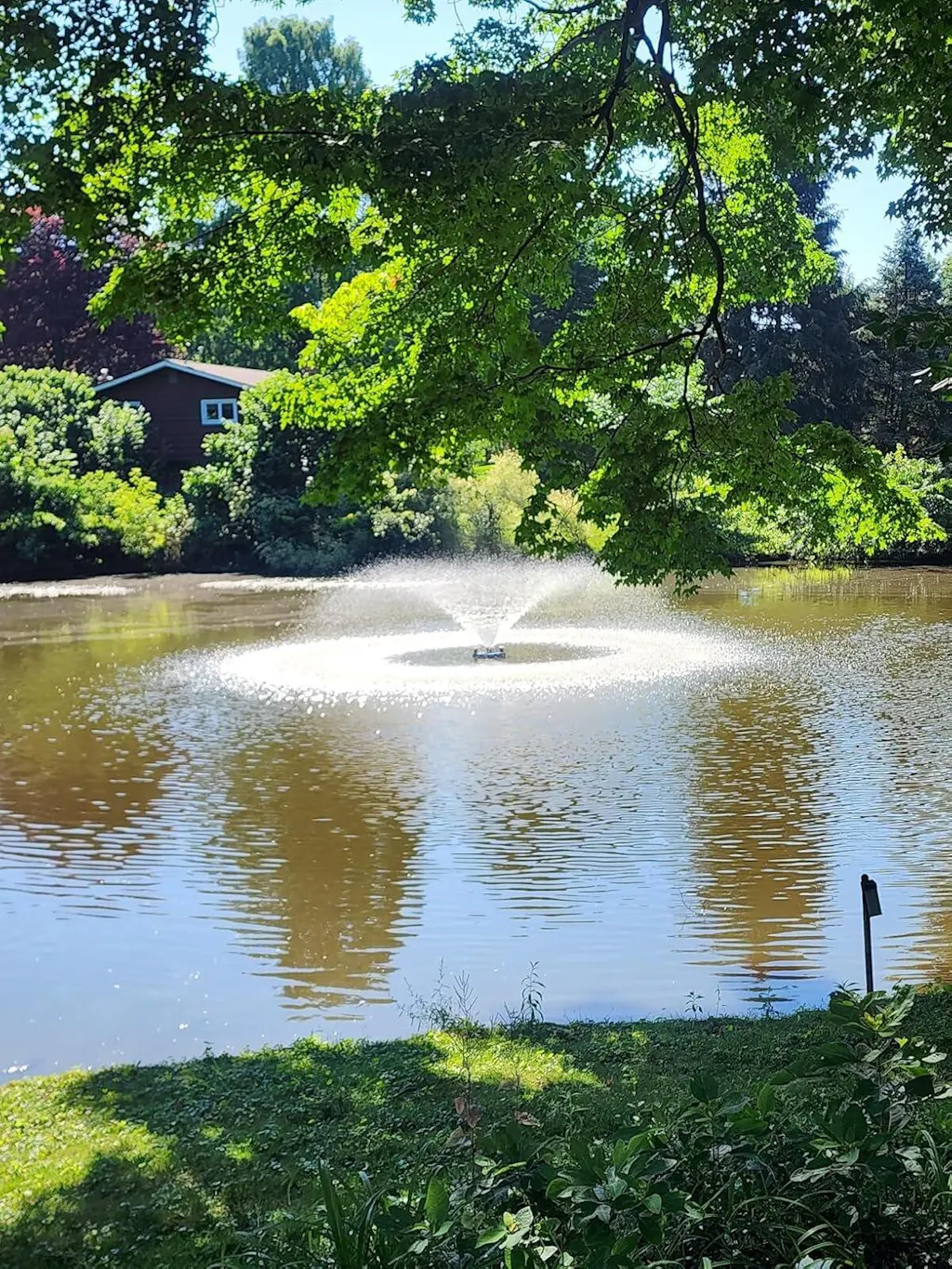 This pond fountain is fantastic! It comes equipped with a powerful 1-horsepower water pump, producing a strong water flow and a wide spray range. A drainage system can also be used to drain the pond if needed. This fountain works well and is a wonderful addition to the pond. It provides oxygen and water flow, which is essential for a pond. Overall, I am very satisfied.